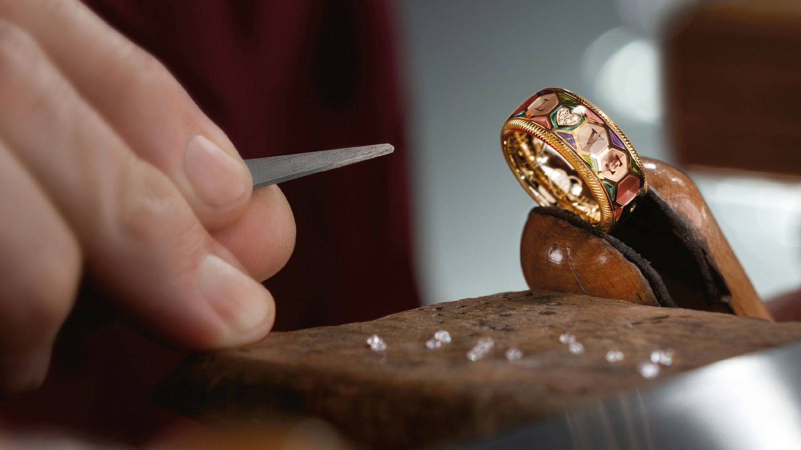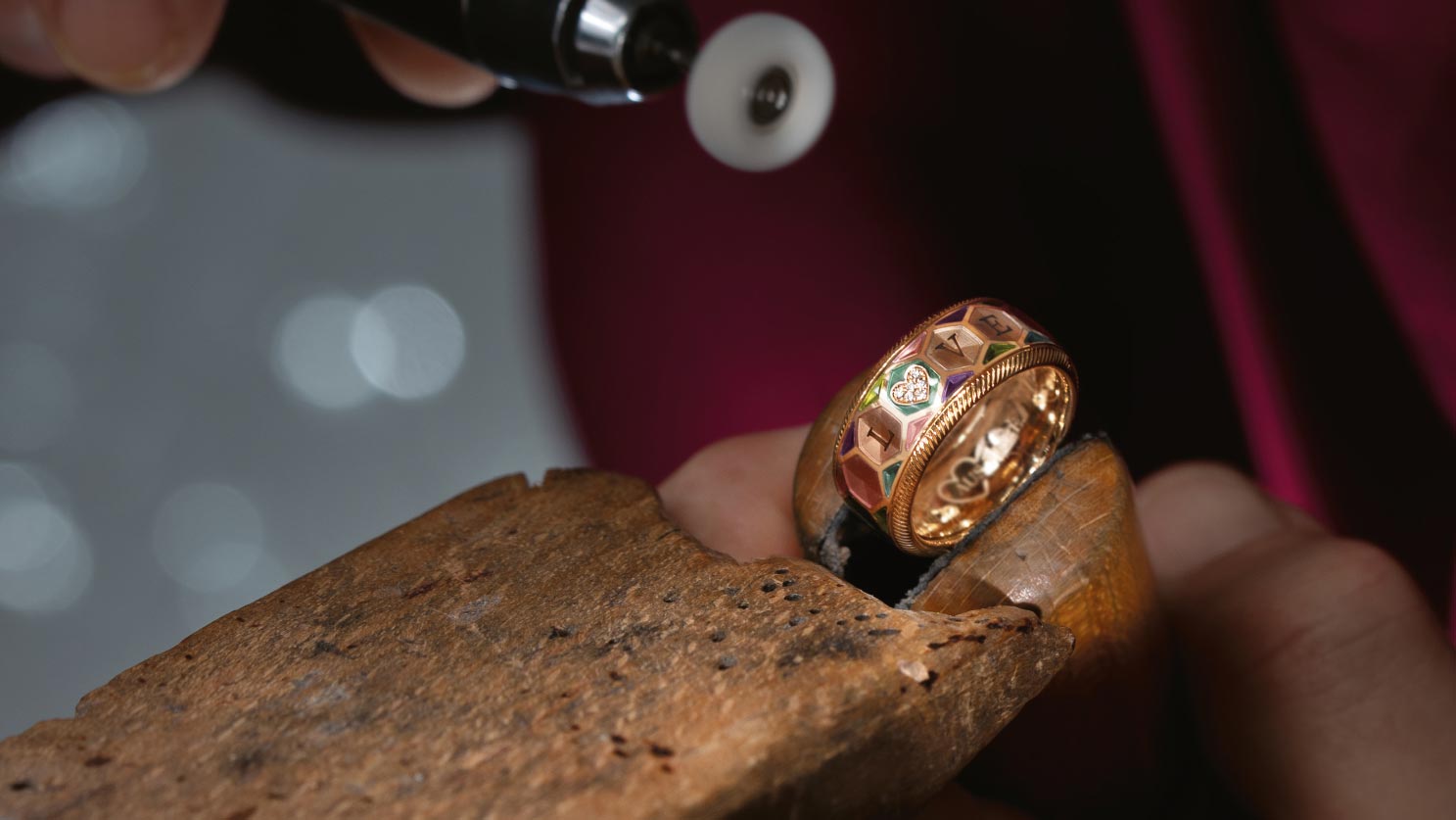 Acht neu entwickelte Kaltemaillefarben verleihen dem Jahresring 2026 seine außergewöhnliche Tiefe: von Petrol über Nude bis hin zu Violett. In präziser Handarbeit werden sie Schicht für Schicht auf die 48 Flächen des Rings aufgetragen, bis sie ihre volle Leuchtkraft entfalten.