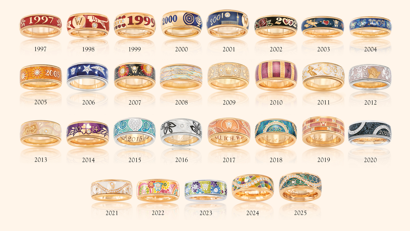 Neue, markante Kordelränder rahmen den Ring wie eine Signatur. Als unverwechselbares Zeichen der Wellendorff-Manufaktur werden sie mit eigens für diesen Jahresring entwickelten Diamant-Werkzeugen direkt in das massive Gold gearbeitet.