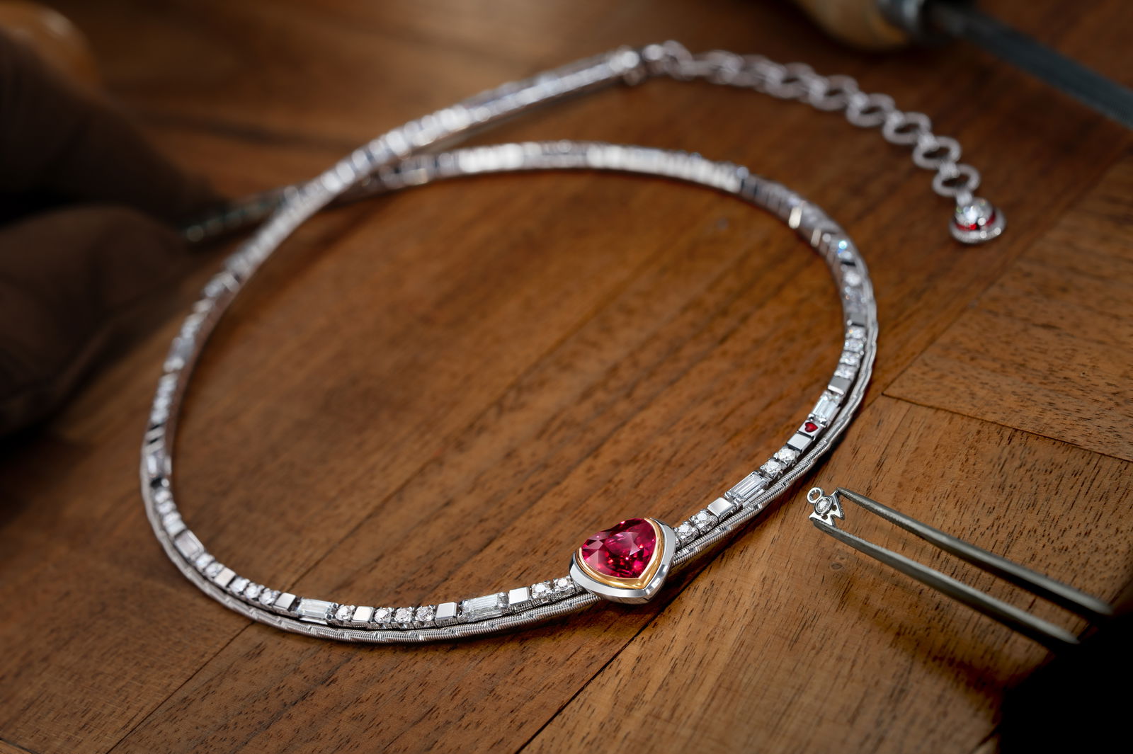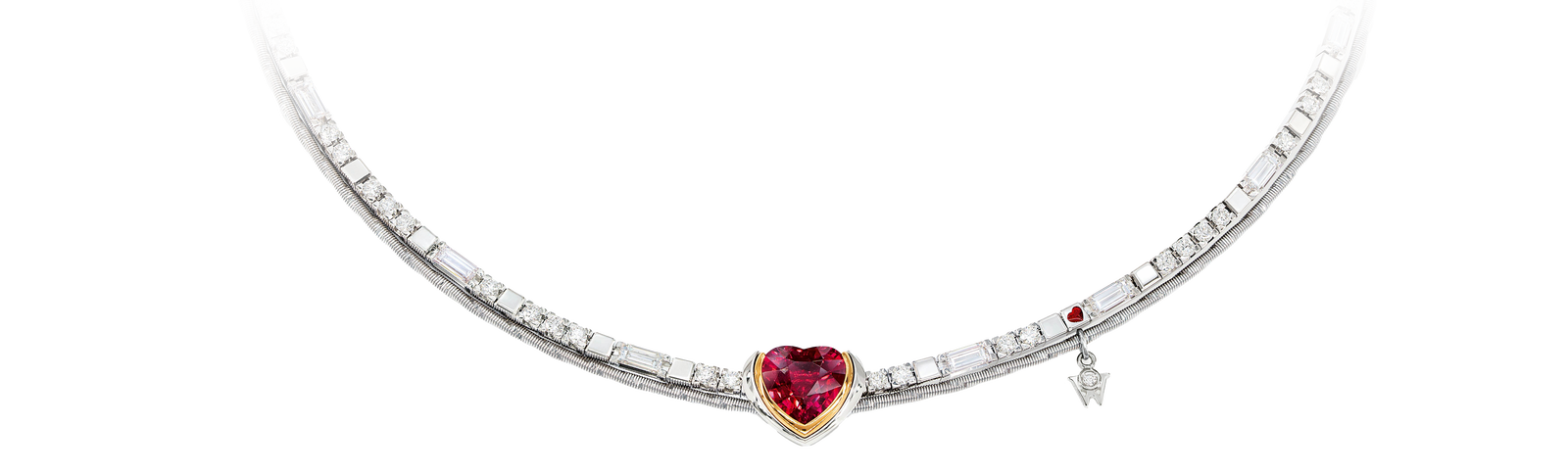 러브 딜라이트 네크리스는 모잠비크산 3.26캐럿 루비가 모든 시선을 사로잡습니다. 예술적으로 세공된 이 하트 모양 루비는 하나의 진정한 사랑을 상징합니다. 이 주얼리의 특별한 매력은 정교하게 제작된 세팅에 있으며, 이러한 세팅은 우아한 스톤을 견고하게 고정합니다. 세팅의 외측 가장자리가 네크리스의 화이트 골드 톤을 강조하는 반면에 따뜻한 옐로우 골드가 루비를 감싸고 있어 스톤은 따뜻한 레드 톤으로 빛나며 그 특별함을 표현합니다. 오픈 디자인의 세팅 덕분에 입사되는 빛이 루비에 직접 비쳐 광채는 더욱 화려해집니다. 세팅의 뒷면도 로맨틱한 놀라움을 선사합니다. 매끄러운 화이트 골드 큐브 위 박동하는 레드 컬러의 콜드 에나멜 하트는 스톤의 형태를 떠올리게 합니다. 총 다이아몬드 중량 4.986캐럿에 추가된 10개의 바게트 컷 다이아몬드 und 63개의 브릴리언트 컷 다이아몬드 및 18캐럿 화이트 골드 로프는 루비의 아름다움을 완성하고, 진정한 ‘사랑의 환희(Love’s Delight)’를 기억하게 합니다. 강렬한 붉은 색의 루비는 라틴어 rubeus(붉은색)에서 유래되었으며, 예로부터 사랑의 행운석으로 여겨지기도 했습니다. 3차원으로 세팅된 콜드 에나멜의 자그마한 레드 하트는 이 주얼리의 의미를 더욱 특별하게 합니다.