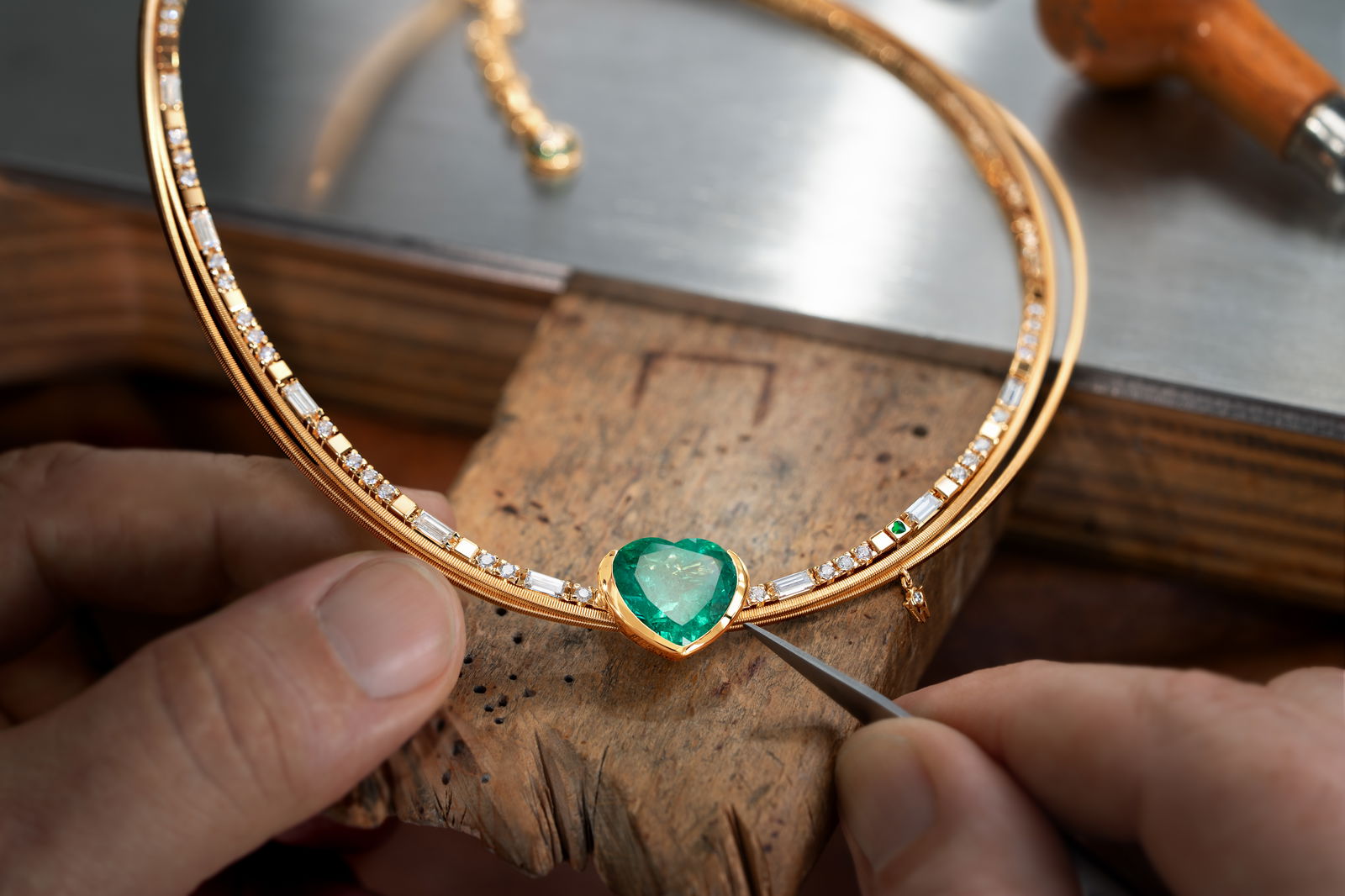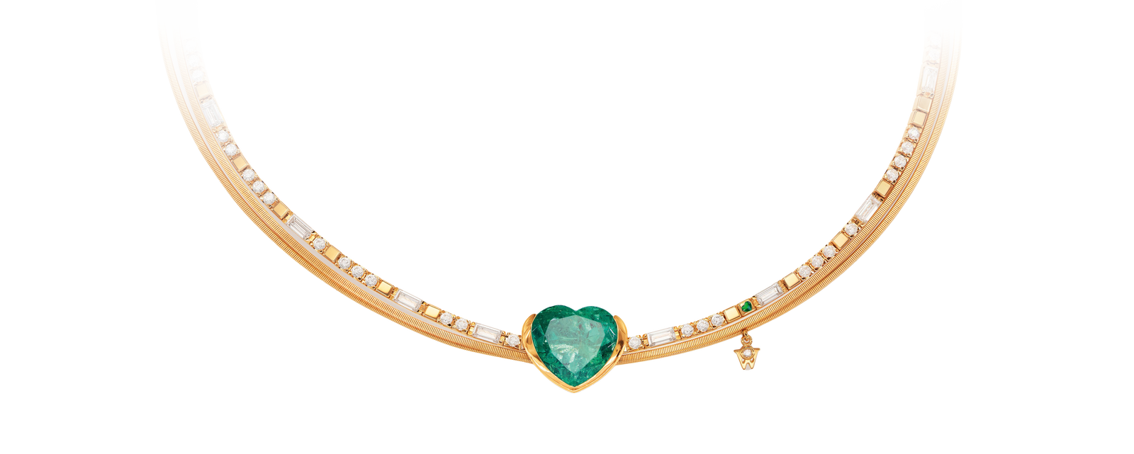 옐로우 골드로 제작된 매직 에메랄드 네크리스는 오픈 디자인 형태의 세팅이 10.72캐럿 콜롬비아산 에메랄드를 안정적으로 고정하고 동시에 그 빛을 아름답게 보여줍니다. 우아한 하트 컷은 보석의 빛을 깊이 있게 드러냅니다. 오픈 디자인 세팅으로 다양한 각도에서 쏟아지는 빛이 에메랄드에 직접 닿기 때문에 보석 내부에서 다양한 빛의 음영이 독특하게 빛납니다. 18캐럿 옐로우 골드로 제작된 두 개의 퓨어 로프는 63개의 반짝이는 다이아몬드, 11개의 완벽한 바게트 컷 다이아몬드, 그리고 그린 컬러의 콜드 에나멜로 제작된 작은 하트와 조화를 이루며, 딥 그린 컬러의 에메랄드 빛을 더욱 돋보이게 합니다. 그렇게 매직 에메랄드 네크리스는 숨이 멎을 듯한 아름다움으로 시선을 사로잡습니다. 에메랄드는 세상에서 가장 매혹적인 보석 중 하나입니다. 반짝이는 그린 컬러와 탁월한 깊이감은 아름다움, 조화, 희망의 상징으로 여겨져 왔습니다. 에메랄드의 전형적인 특징이라 할 수 있는 미세한 함유물은 ‘자르댕’(Jardins, 프랑스어로 ‘정원’을 뜻함)으로 불립니다. 이 함유물이 마치 미세한 나뭇가지 같은 선으로 스톤을 가로지르며 깊이와 특성을 부여해 모든 에메랄드는 각기 고유한 개성을 지니게 됩니다. 이러한 내부의 구조는 에메랄드의 자연스러운 형성 과정을 보여주며 그 특별함을 강조합니다.