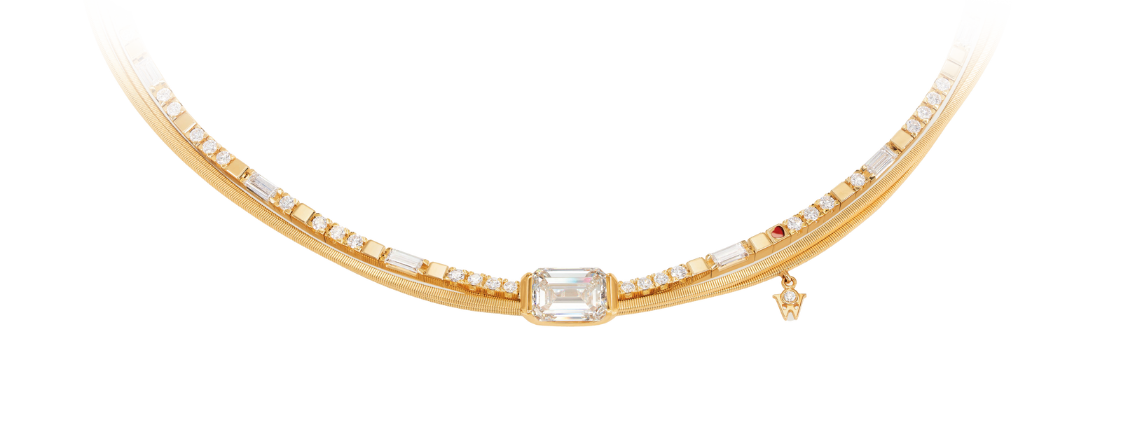 마이 모먼트 네크리스의 하이라이트는 4.01캐럿의 에메랄드 컷 다이아몬드입니다. 완벽함을 선사하는 이 다이아몬드로 네크리스는 심플하면서도 현대적이고, 동시에 시대를 초월하는 크리에이션으로 거듭납니다. 오픈 디자인의 옐로우 골드 세팅은 ‘공중에 떠 있는 듯한’ 스톤의 매혹적인 모습을 드러냅니다. 0.01mm 단위의 정밀함과 완벽함은 스톤을 안정적으로 고정합니다. 옐로우 골드 세팅의 좌우 가장자리만 지지하는 디자인은 절제된 아름다움이 돋보이고, 거의 거의 모든 방향에서 쏟아지는 빛이 다이아몬드에 반사되어 내부에서부터 빛나는 독특한 효과를 연출합니다. ‘퓨어 딜라이트’ 제너레이션의 18캐럿 옐로우 골드 로프와 반짝이는 브릴리언트 컷 다이아몬드, 그리고 투명한 바게트 컷 다이아몬드가 조화를 이룬 이 네크리스는 총 4.773캐럿의 압도적인 스케일을 자랑하며, 세련된 우아함과 놀라운 매력을 동시에 선사합니다. 브릴리언트 컷 다이아몬드로 장식된 연장 체인을 이용해 착용자가 직접 네크리스의 길이를 조절할 수 있으며, 동시에 맞춤 인그레이빙을 위한 완벽한 공간을 제공합니다. 레드 컬러의 작은 하트가 특별함을 더하며, 하트의 의미는 오직 착용자에 의해 결정됩니다.
